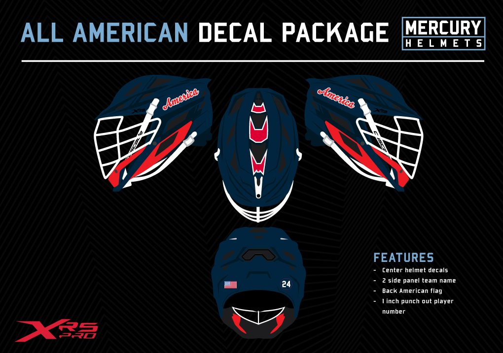 All American Decal Package is a premium helmet decal solution designed specifically for the Cascade XRS lacrosse helmet, delivering a bold, clean, and professional look for teams at every level. This complete decal package is ideal for programs looking to elevate their helmet design with customization, durability, and standout detail.