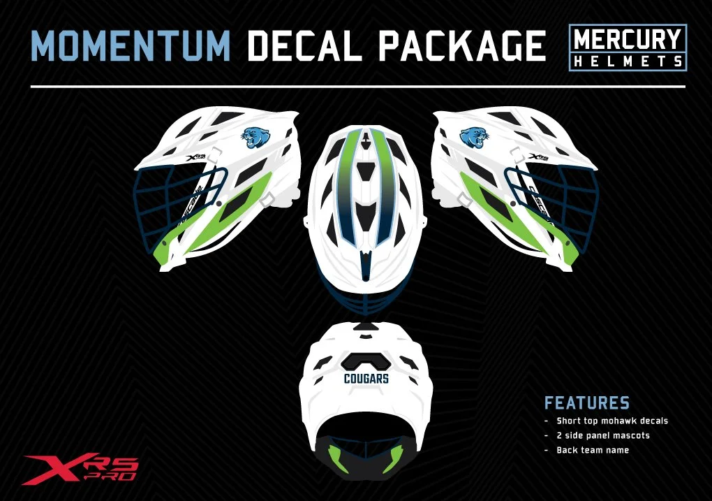 The Momentum Decal Package is a fully custom helmet decal kit designed specifically for the Cascade XRS lacrosse helmet. This package is ideal for programs looking to upgrade their helmets with a clean, professional, and fully customized look.
