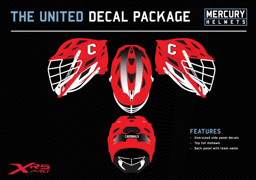 The United Decal Package is a fully custom lacrosse helmet decal package designed specifically for the Cascade XRS Pro helmet. This premium package delivers a bold, professional look with decals engineered for a clean, helmet‑specific fit.